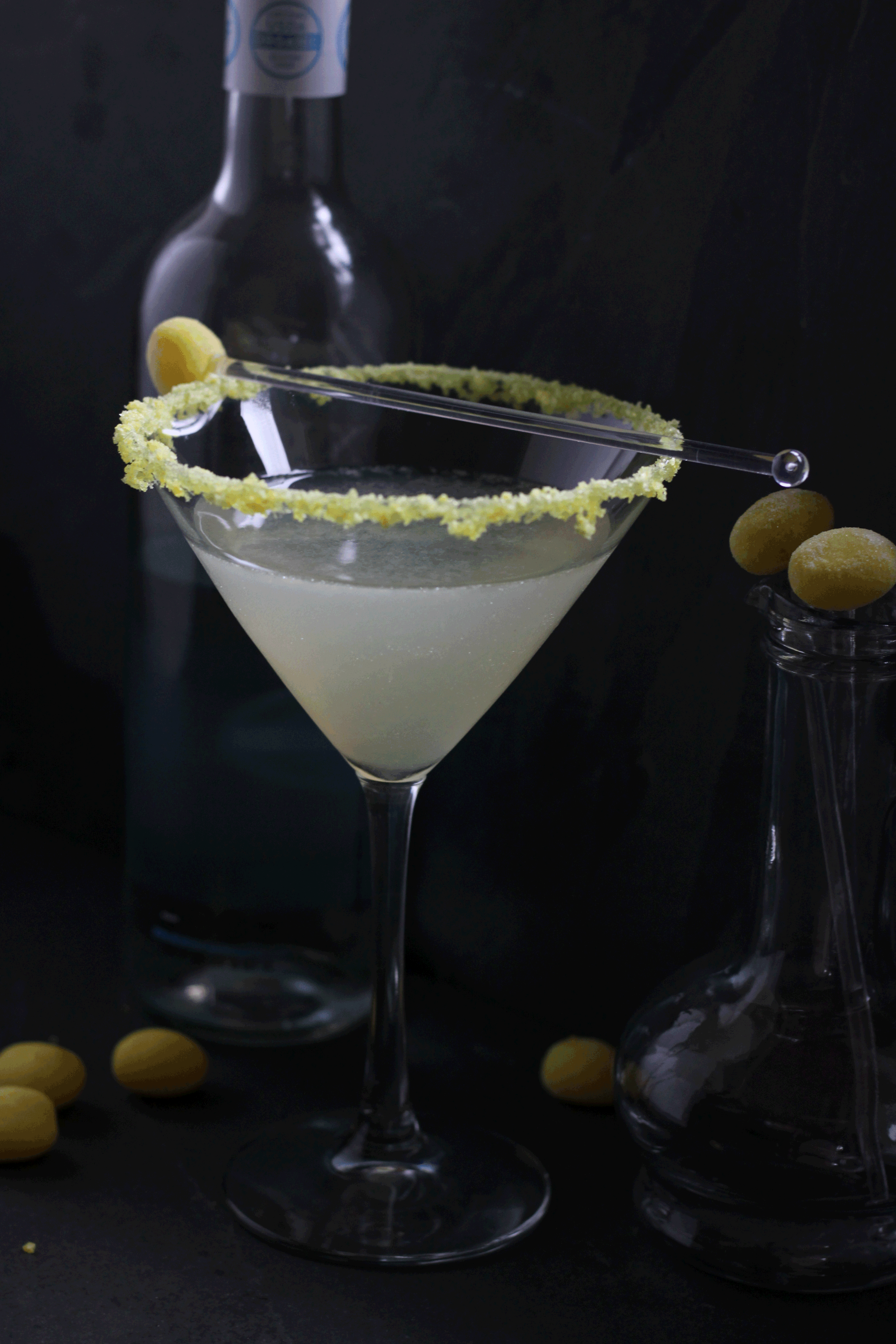 The pucker perfect Lemon Drop with a crushed candy rim & a Lemon Drop swizzle.