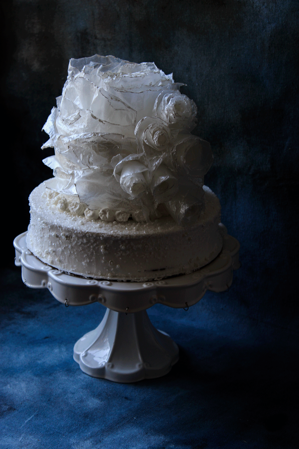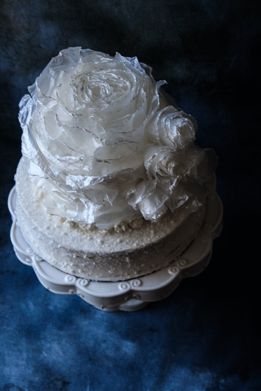 Apply your first layer of rice paper to the sides of the cake pressing gently into the buttercream to adhere. Spritz edges with a bit of vodka & press edges together. Tear rice paper down to 2 1/2” from the top of the cake.