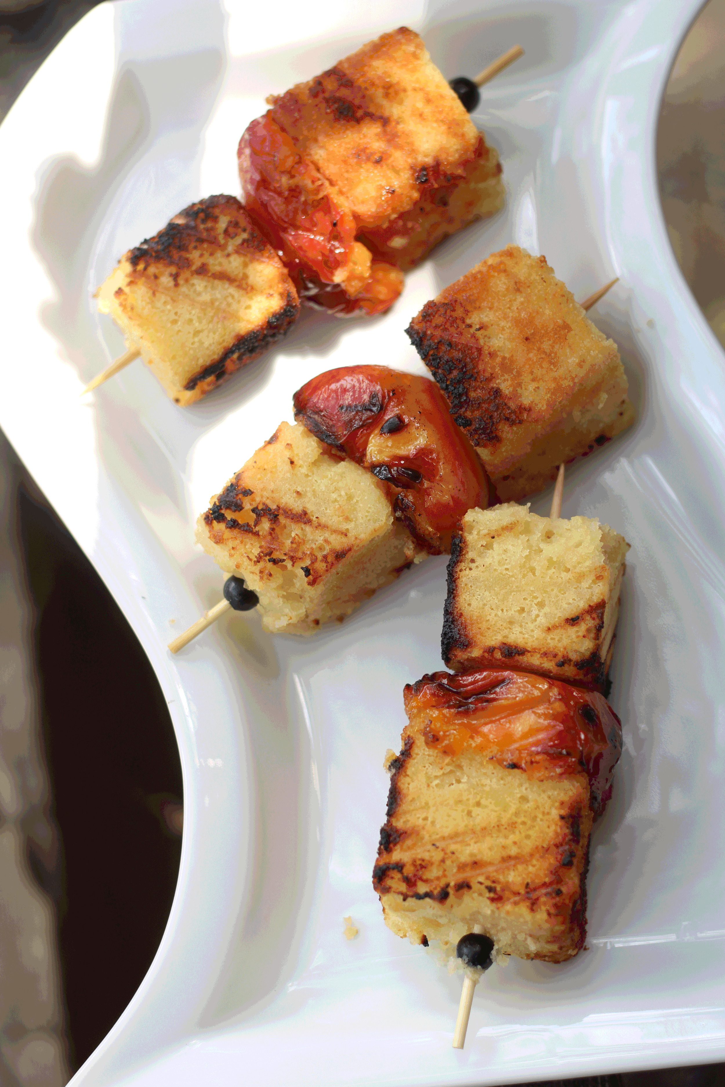 The images above give some different versions of this recipe. The first image (left to right) is an almond pound cake version with peaches. The second image shows sautéing nectarines in brown butter & maple syrup finishing with a splash of with Tuaca. In the last image an electric Habachi was used to toast the pound cake & nectarine skewers rather than over an open fire for an indoor version.