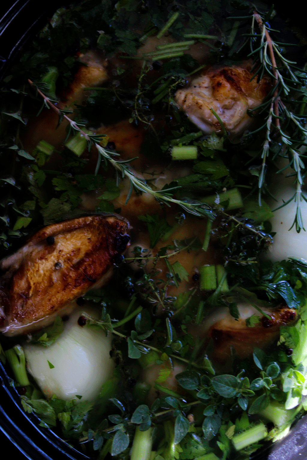 Adding mirepoix (onion, celery, carrot) contributes to flavor, nutrients as well adding body to your stock. I peel my onion & quarter. Celery, you can use scraps such as celery leaves & less desired stalks, rinsed & cut into chunks. Carrots simply need to be rinsed or scrubbed of possible debris, not need to peel, cut into chunks. Most stocks do not contain garlic as it tends to overwhelm. I add garlic to mine because I am a garlic lover & it has wonderful medicinal qualities. The addition of herb & spices serves to add complexity as well as lending an earthy balance to your stock. Minimum, you need parsley. I use a combination of parsley, rosemary, lemon thyme & oregano with bay leaf & pepper corns. Some chefs tie these up in a sachet of cheesecloth with cooking twine & drop it into the stock so it can later be removed. This is referred to as a bouquet garni. Personally, I free float my herbs & aromatics, as the broth gets strained in the end anyway & I feel it adds to the potency.
